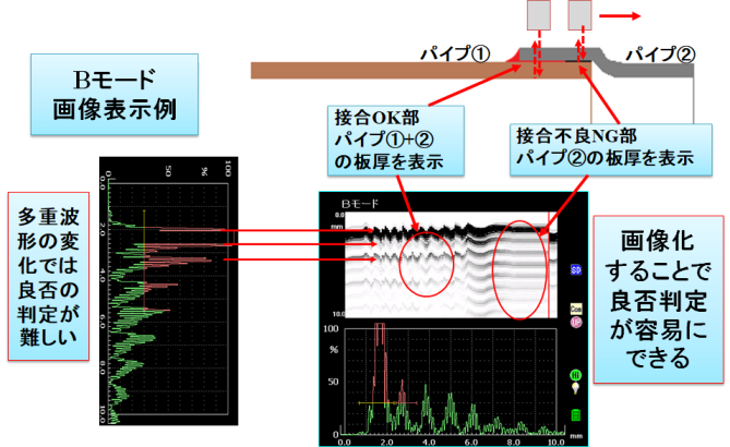 超音波が材料に入射する位置と探傷器の時間軸の基点を合わせることでビーム路程(肉厚)を正確に測ることができる。